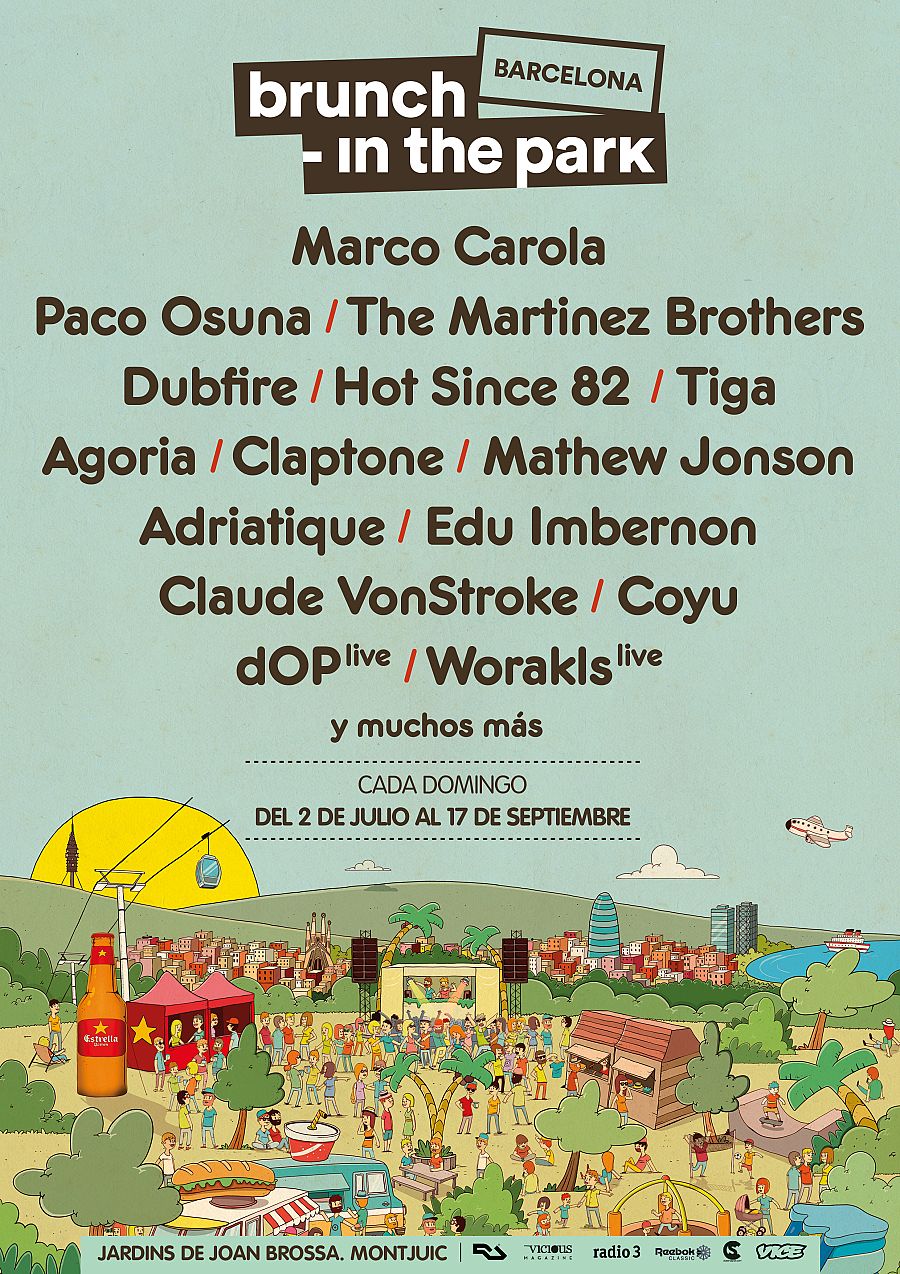 Cada domingo Brunch -In The Park llenará de música los Jardines de Joan Brossa, en Montjuïc con sesiones de 13:00 a 22:00 horas de artistas como los nuevos reyes del house The Martinez Brothers, el infalible Paco Osuna, uno de los nombres más importantes del techno europeo, el DJ y productor francés Agoria presentando su nuevo sello Sapiens, el deep house enmascarado de Claptone, la súper estrella canadiense Tiga, dueño de una carrera a medio camino entre el synth pop y el house más desacomplejado, el guardián de la esencia del techno Marco Carola, uno de los maestros del minimal techno, Dubfire -quien fue la mitad de los míticos Deep Dish-, el DJ inglés Hot Since 82, uno de los nombres básicos del verano en Ibiza gracias a su presencia en las fiestas Labyrinth en Pachá, el dúo Adriatique, cuyas míticas sesiones basculan en tensión entre la contemplación y la energía hasta conseguir uno de los sonidos más únicos del techno europeo, o el impecable productor de tech-funk Claude VonStroke. A ellos se suman en esta primera tanda de confirmaciones 57 artistas.
