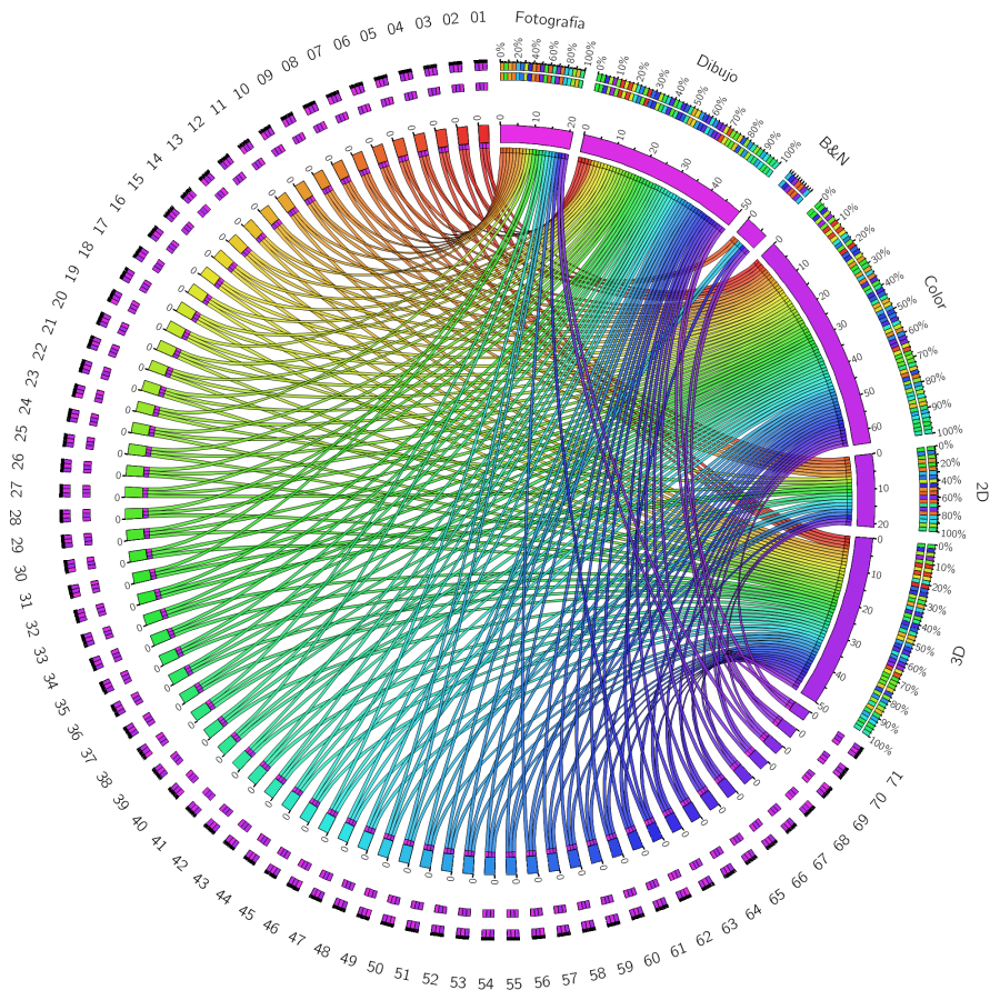 Diagrama de cuerdas con las categorías formales de las imágenes y la muestra de imágenes recopiladas. Cada número se corresponde con una de las imágenes de la muestra. Cada cuerda indica la conexión entre la imagen y el atributo de imagen estudiado. Obsérvese la menor cantidad de fotos, imágenes en 2D y en blanco y negro, que son las que suelen corresponder a las imágenes reales del SARS-CoV-2.