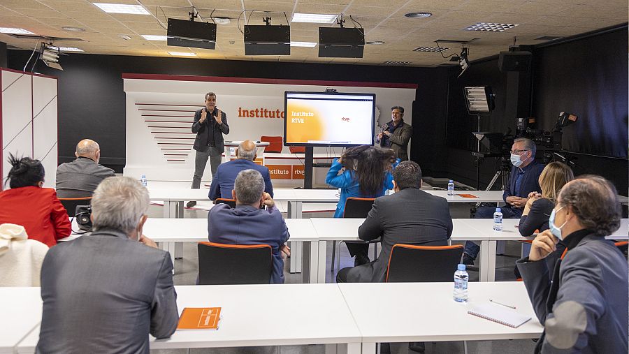 Madrid 16/02/2022. Profesionales del sector público audiovisual y del sector educativo de Portugal, Argentina, Ecuador, México, Panamá, Chile, Colombia, Puerto Rico y Venezuela, tuvieron ocasión este miércoles de conocer el trabajo docente del Instituto de RTVE, Centro que el año pasado impartió 656 cursos a 6.334 alumnos, con más de 18.000 horas de formación.