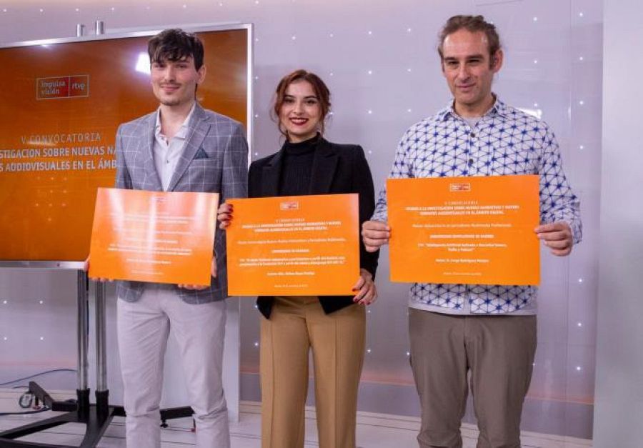 RTVE ha acogido hoy la ceremonia de entrega de los diplomas de la V Convocatoria de Ayudas a la Investigación (ver vídeo) sobre ‘Nuevas narrativas y nuevos formatos audiovisuales en el ámbito digital’. Los alumnos de la UCM Jorge Rodríguez y Jesús Montanero y la alumna de la UGR Fátima Reyes han sido los ganadores de esta edición.