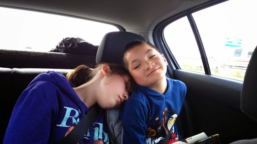 Gracia y David durante su infancia en un coche