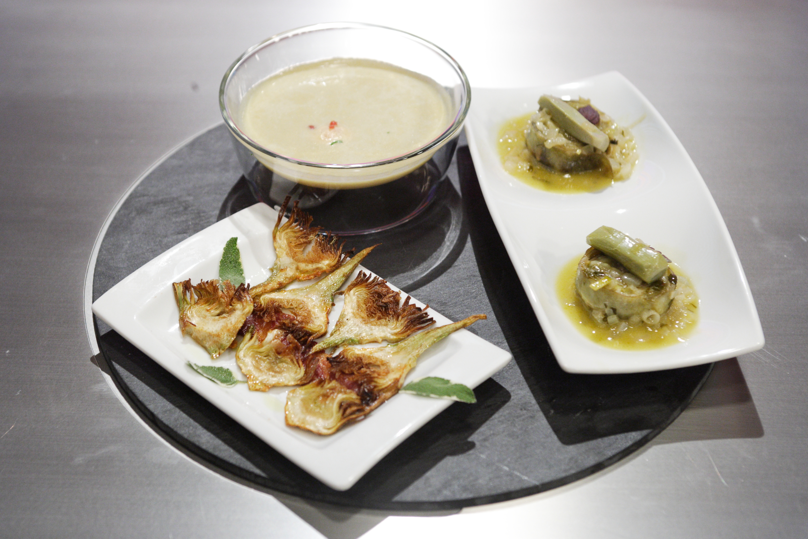 - Por otro lado, sofreímos todas las verduras con sal y pimienta y mojamos con el caldo sin cubrir del todo. Cuando estén cocidas las alcachofas y las patatas se tritura y se añade un poco mas de aceite, se emulsiona y se sirve.