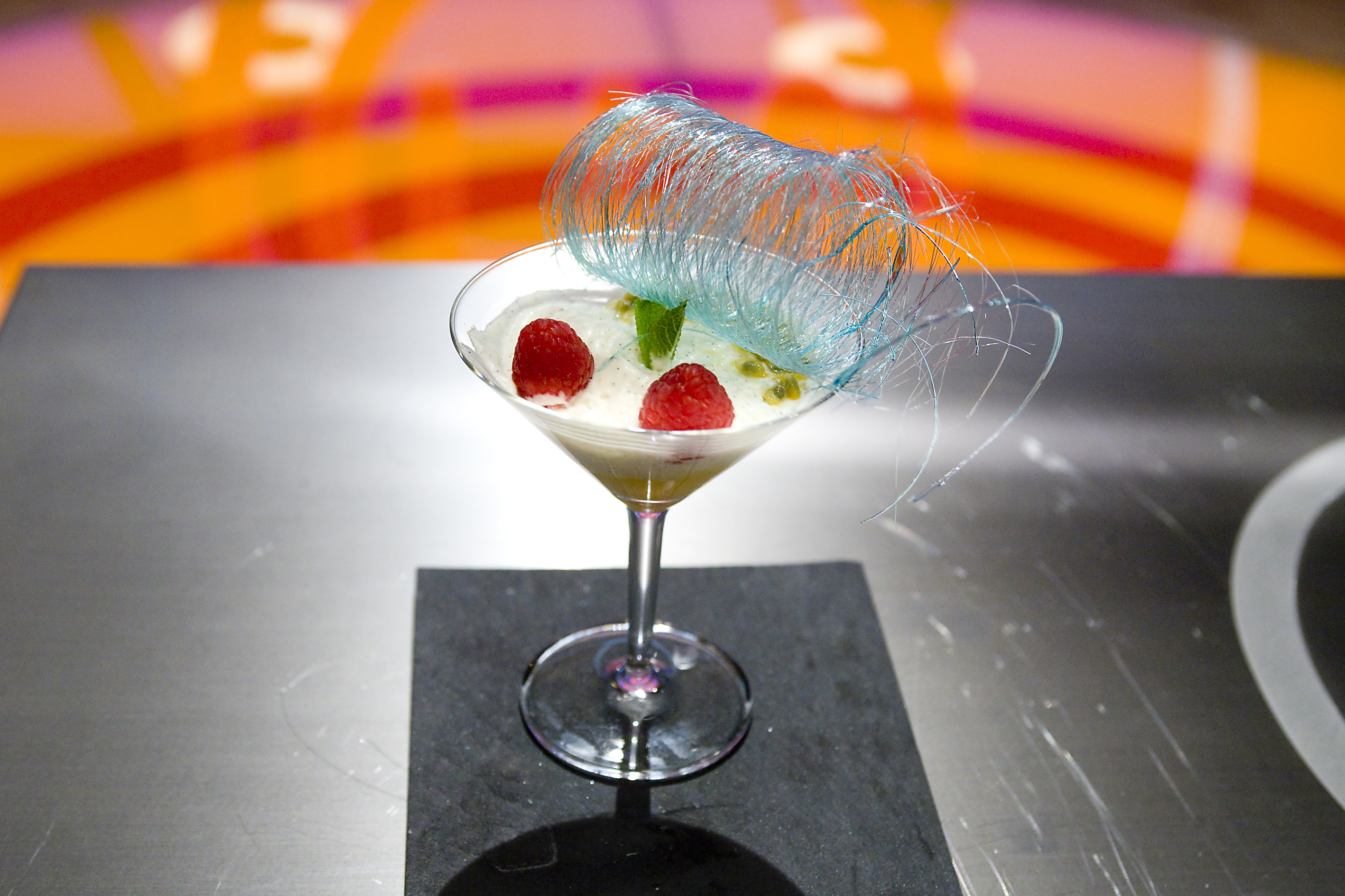 Mousse de nata a la vainilla, con crema de yema y muelle de azúcar