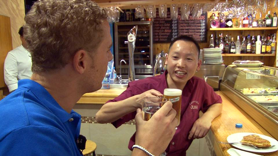 En el otro lado de la escala social está Chen, vive en Usera, el núcleo urbano con más concentración de ciudadanos chinos. 7.000 asiáticos habitan y trabajan este barrio apodado el “Chinatown” madrileño donde el precio del alquiler es de los más bajos de la capital. Tiene esposa e hijos y asegura que una familia china con tres hijos es una familia feliz. Regenta un bar, corta jamón como un experto en jabugo y vive de servir cañas y hacer tortilla española.