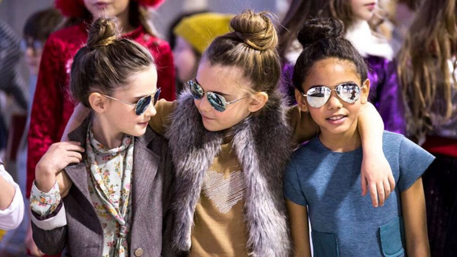 Por eso vemos tonos bosque, nueces y roble pero también grises, petróleo, mostaza y rosa cuarzo. Los estampados son suaves, siempre con un toque romántico y etéreo, y se trabajan las texturas de algodón y felpa para que contrasten con cuero, neopreno y pelo largo. Muchas de las líneas de la colección están en perfecta consonancia con lo que vemos en las pasarelas de mayores.