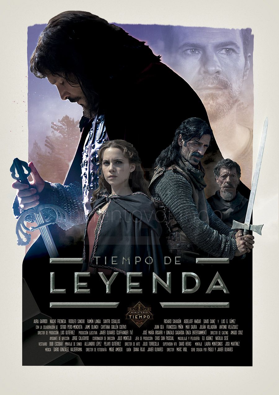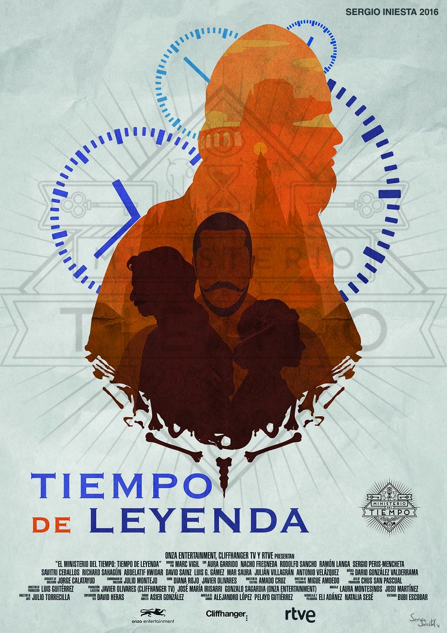 A través de de un estilo minimalista he intentando esencializar la trama del primer episodio de esta nueva temporada. Así pues, podemos encontrarnos elementos que hacen referencia a la concepción actual que tenemos de la figura del Cid, como los tres lugares por los que pasaron sus restos, así como los elementos que darán este nuevo giro de tuercas a la historia, a saber, los huesos del Cid, y por supuesto nuestros aventureros protagonistas, todo ello contenido en la silueta del imponente y mismísimo Cid. De fondo y rompiendo con la gama cromática del resto del diseño, los relojes que simbolizan el tiempo siempre presente en nuestra querida serie. Me parecía oportuno que el tiempo tuviese un papel relevante en cuanto a lo visual, tratándose de la vuelta de la serie y por tanto, teniéndonos que poner en situación de nuevo a la hora de afrontarla con el espíritu adecuado. Al final todo queda empastado y esencializado de tal forma, que a pesar de estar formado el diseño por diversos elementos, se perciben todos de forma rápida y concisa, que es por otra parte, lo que intento conseguir con todas mis obras.
