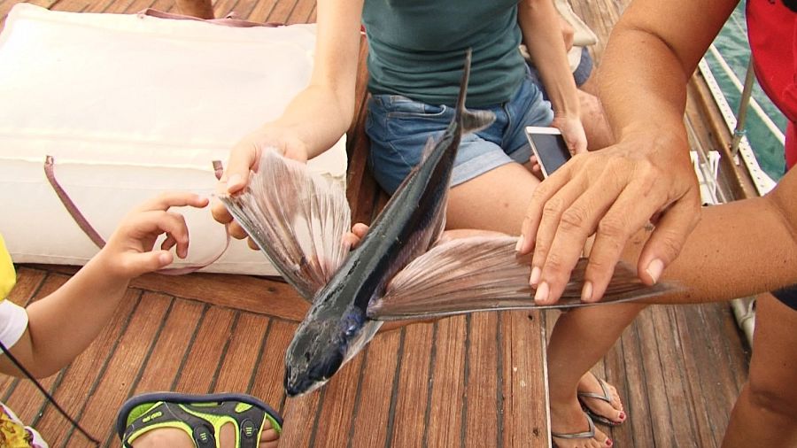 El pez volador cruza El Estrecho. Es una de las fotos más buscadas para quienes apuran los últimos días de vacaciones y uno de los momentos más esperados para quienes viven de su pesca en El Estrecho de Gibraltar. Todos quieren ver al pez volador planeando sobre el mar y el tiempo corre, su visita dura poco más de un mes. En Estepona han echado mano de los marineros para ofrecer una ruta turística. Sonia es una de las guías que trabaja en la zona, acompaña a viajeros y pescadores para descubrir los secretos de su pesca. En alta mar beben vino criado en la profundidad del océano y comen ostras recién capturadas. El pez volador es una joya para los vecinos de La Atunara. En esta barriada de la Línea de la Concepción salan el pez volador de manera artesanal, las familias de pescadores lo venden en pequeños puertos callejeros como si fuera jamón de pata negra.