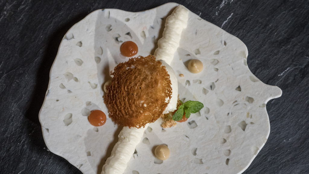 - Montaje: en plato triangular realizar unos trazos pataleos de miel y membrillo, colocar una base de galleta triturada y encima colocar la quenelle de crema de queso y decorar con el crujiente de avellana