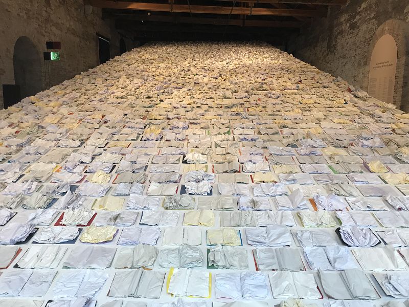 El también primer Pabellón de Madagascar sorprende con una propuesta en la que no se encuentran referencias al país más allá de haber sido concebida por uno de sus artistas estrella. En su poética instalación I have forgotten the night, Joël Andrianomearisoa rinde homenaje a la noche, una experiencia universal compartida por todo el mundo y representada, aquí, mediante una especie de laberinto configurado por miles de hojas de papel de seda negro. El visitante es invitado a perderse en esta “noche de papel”, una noche que, a pesar de haberse vuelto tangible, mantiene su poder evocador, su misterio, su carga nostálgica, y sus múltiples connotaciones contradictorias.