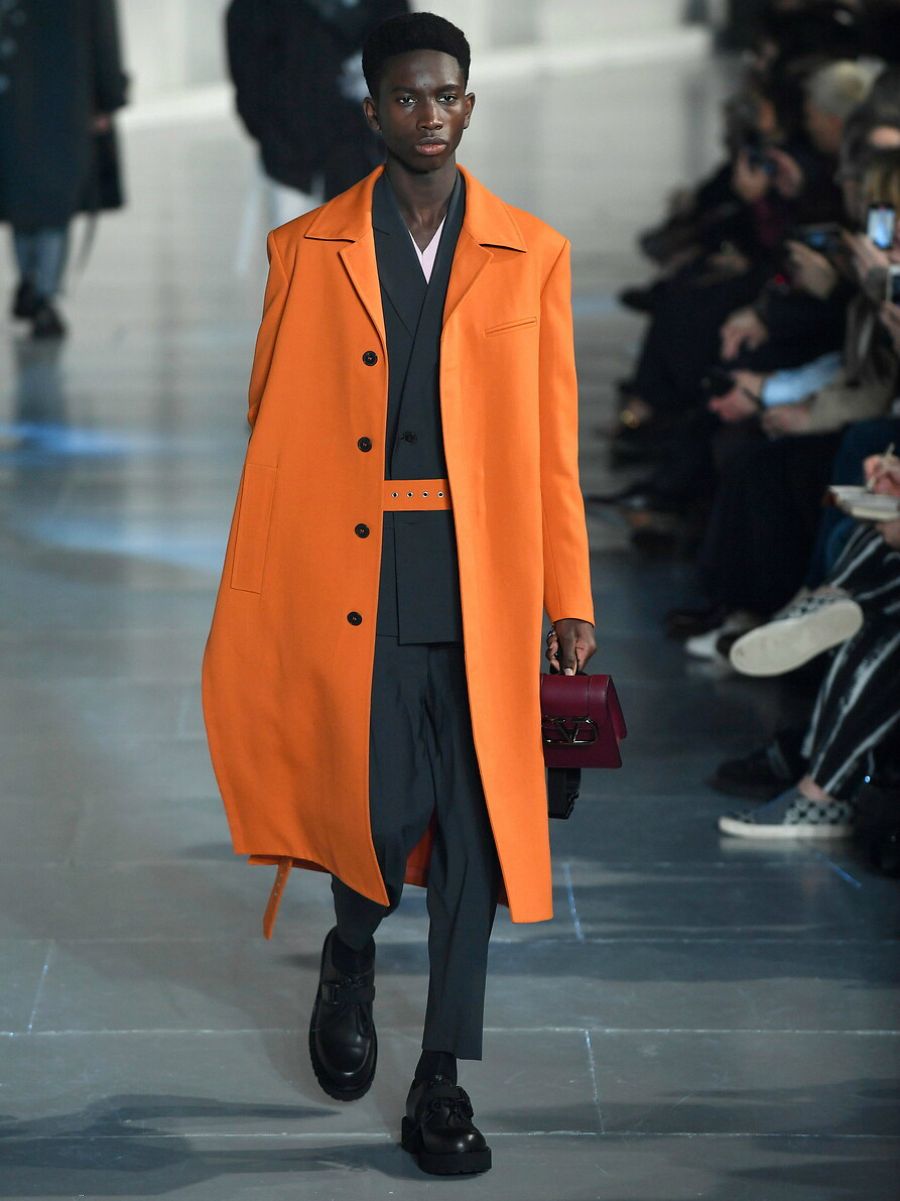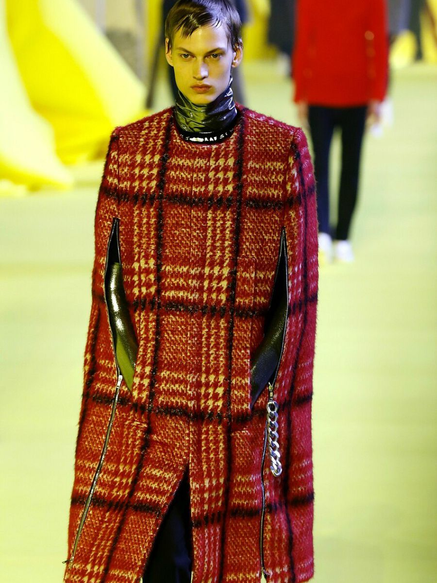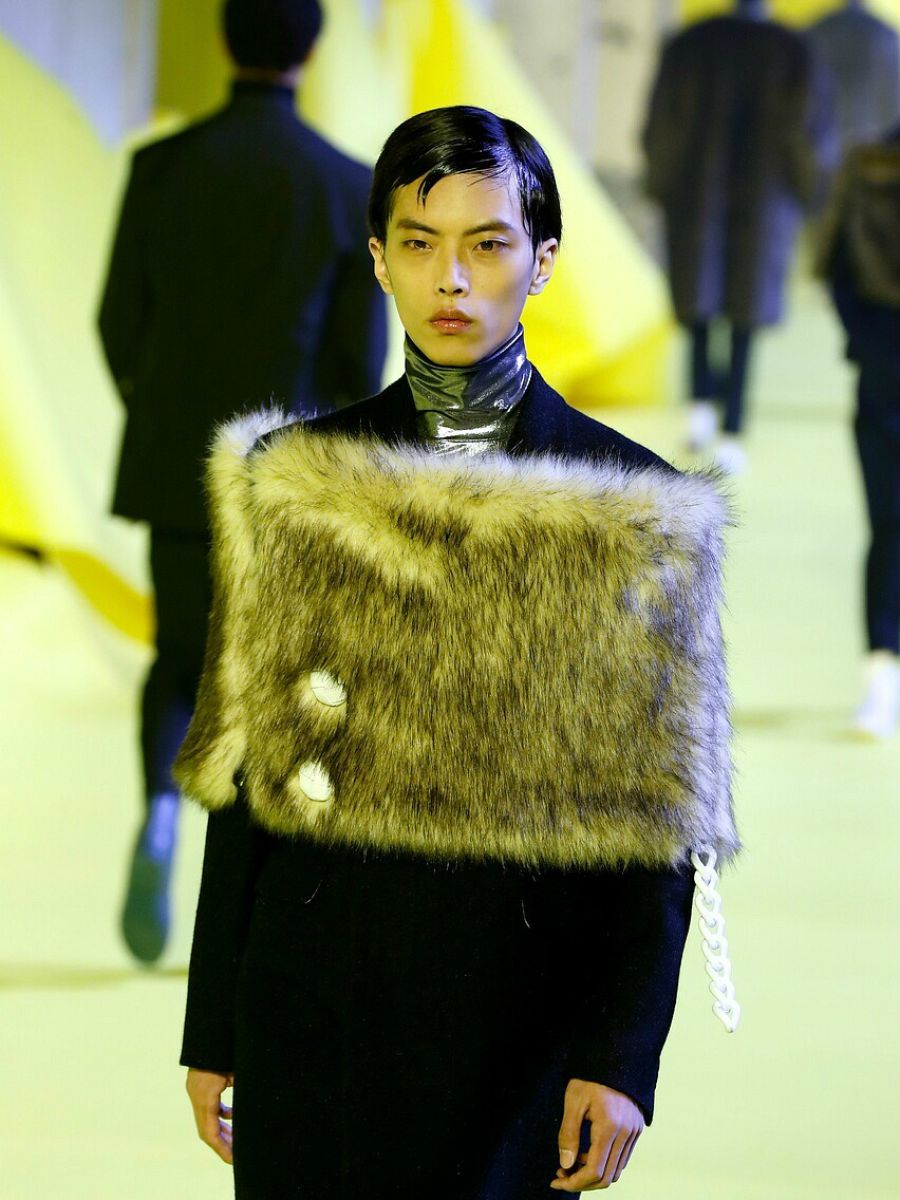 Lo hace en el fondo y en la forma. Vemos palabras y frases escritas en prendas y complementos, y piezas revisitadas del armario femenino que conectan directamente con el movimiento queer, como los abrigos y estolas de piel sintética que saltan de los antros marginales a la principal pasarela de moda masculina. Debajo, jerséis de cuello cisne en texturas atrevidas, vinílicas, en algunos casos similares al látex.