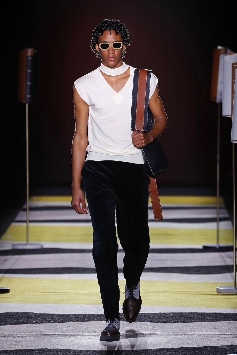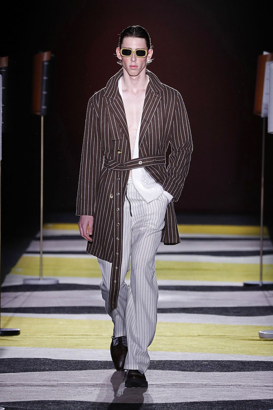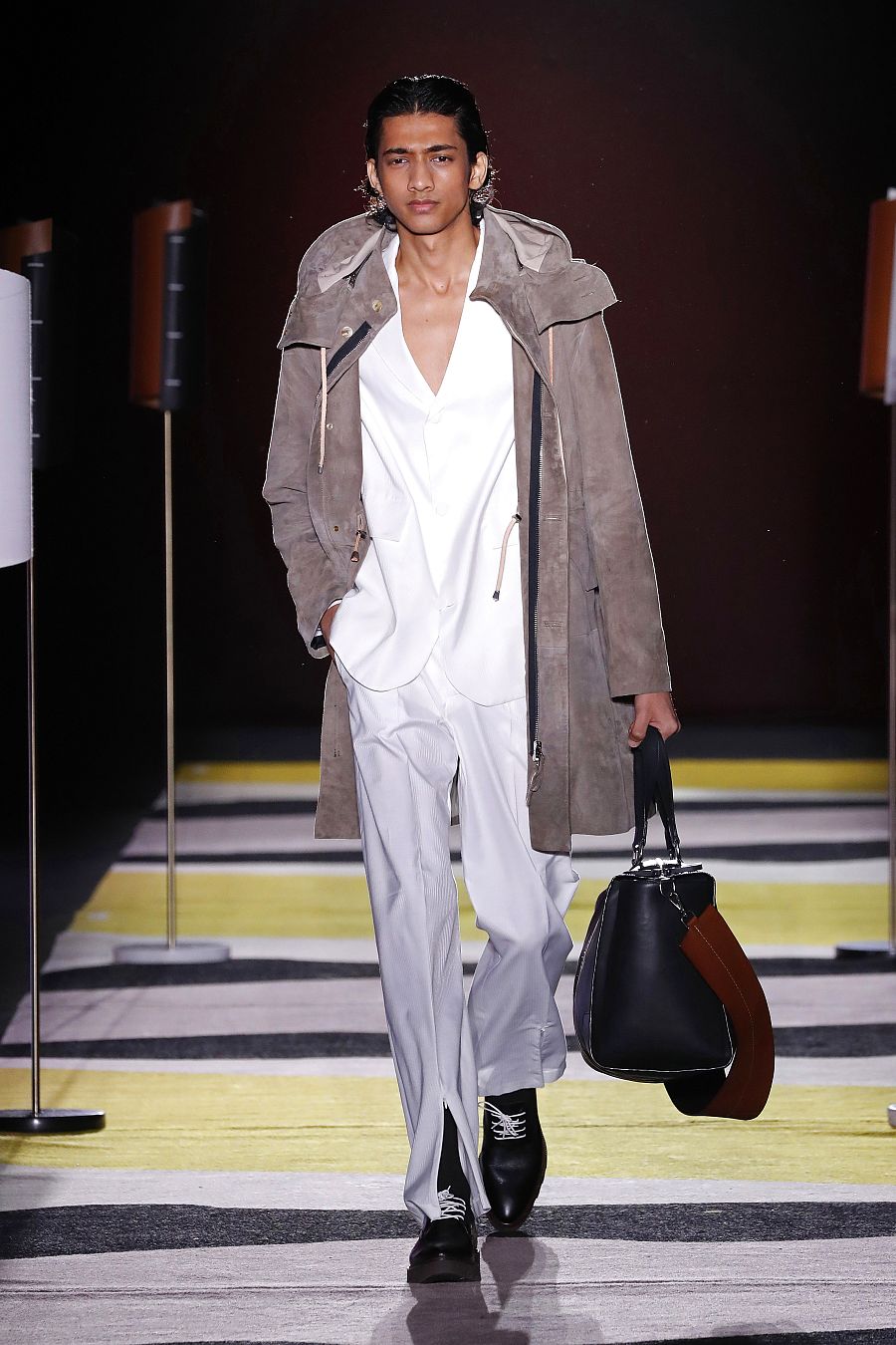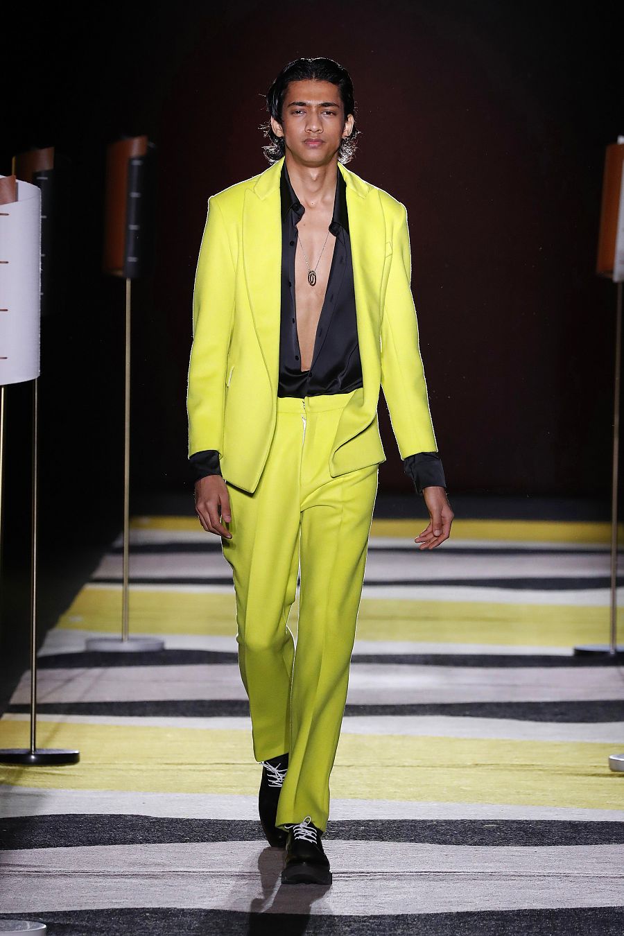La nueva colección es un interesante compromiso con el oficio con el que explora otros caminos diversificando su trabajo. Erroz lleva su mundo al interiorismo y presenta ahora una línea de lámparas y alfombras que se conectan con las prendas a través de los tejidos y los colores. Y sobre esas alfombras y junto a esas lámparas desfilaron sus modelos para contar un viaje “para alejarte y encontrarte”, dice. El primer chico que sale lleva un traje amarillo pistacho con una camisa negra abierta hasta el ombligo y a partir de ahí se desarrolla una colección de una sofisticación contenida y elegante.