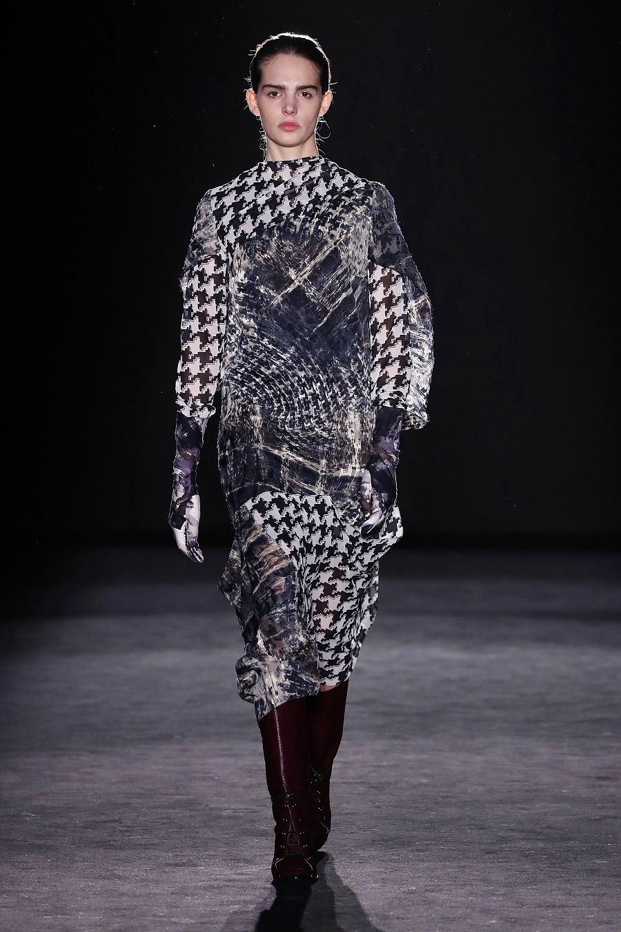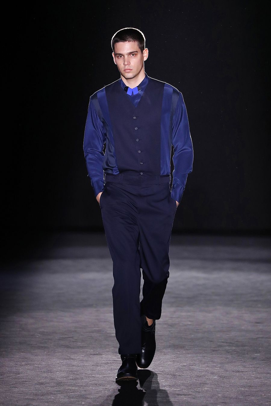 Sofisticada y nostágica, la colección tiene patrones estructurados a través de geometrías, mezclas potentes de texturas mate y brillo, abrigos en lanas con paisajes infinitos y una carta de estampados que saltan desde los abstractos a la pata de gallo y los salvajes. Los chalecos, los vestidos asimétricos y los abrigos, con formas orgánicas, llaman la atención, como los monos para chico que parecen una camisa y un pantalón. La sastrería se reinventa a golpe de tijera para dar protagonismo a las camisas y un golpe de azul eléctrico rompe la contenida paleta de color de negro, gris y blanco.