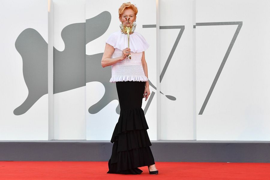 Es la sensación del momento. Tilda Swinton ha trabajado con los mejores directores y tenía pendiente ponerse a las órdenes de Pedro Almodóvar. Sueño logrado. La actriz protagoniza el corto La voz humana que juntos presentan en la Mostra de Venecia y en este festival, además, le han otorgado el León de Oro. Tiene un físico que se aleja de los estándares de Hollywood y ella sabe explotar su androginia y su tímida ambigüedad. A veces viste con prendas muy masculinas y otras veces prefiere prendas muy femeninas, como las de Chanel.