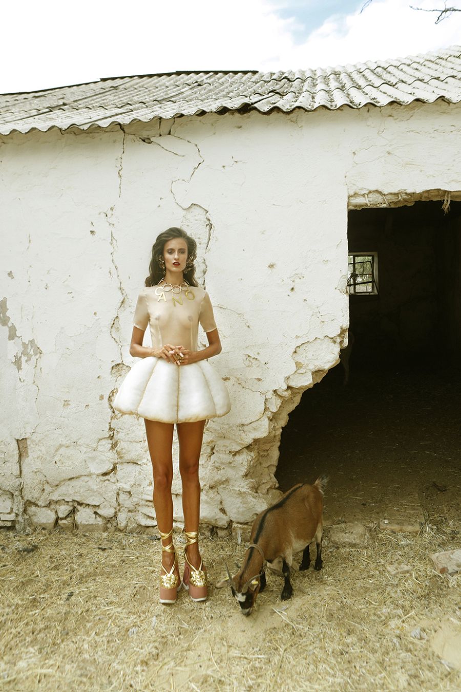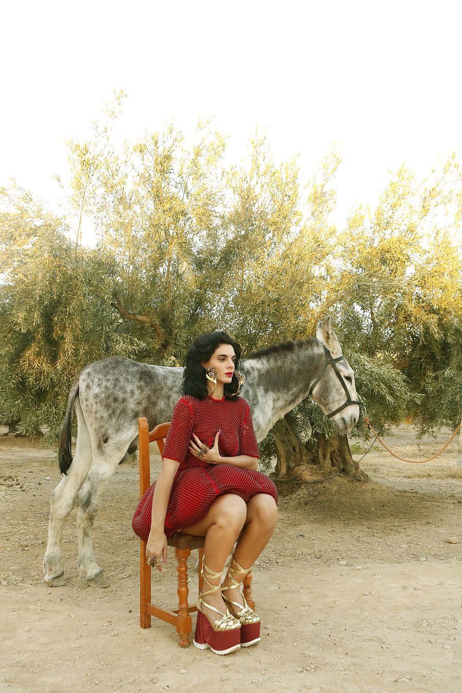 Vestido de organza color camel y collar con maxi aros y letras y pendientes con puñales, y anillos florales. Todo de Leandro Cano y Ginger&Velvet. Antonio Cordero