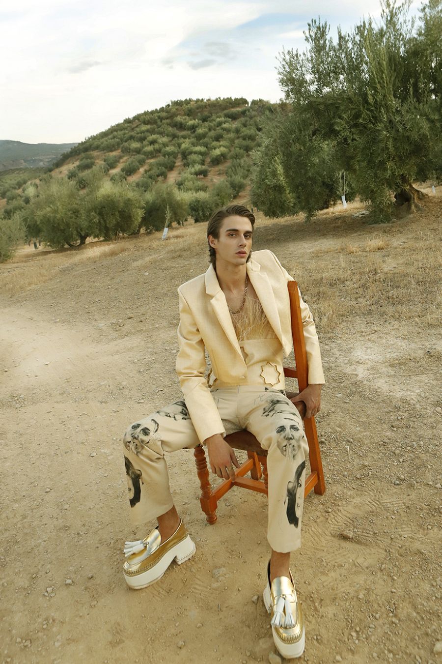 Chaquetilla torera y fajín de arpillera con ornamentación de joyería en forma de estrella. El pantalón es de loneta y color camel con impresión de ilustraciones de caras realizadas por la artista María Rubio. Antonio Cordero