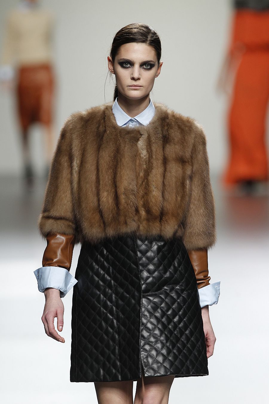 La top Marina Pérez en el desfile de Ángel Schlesser celebrado en febreo en Cibeles. La modelo lleva un cuerpo de piel sobre una camisa y una falda acolchada. EFE