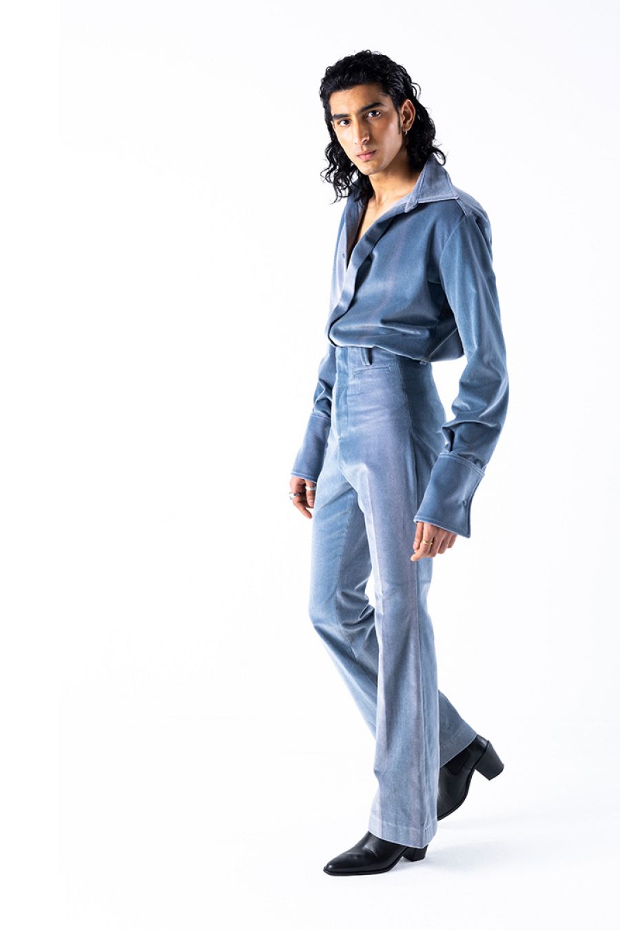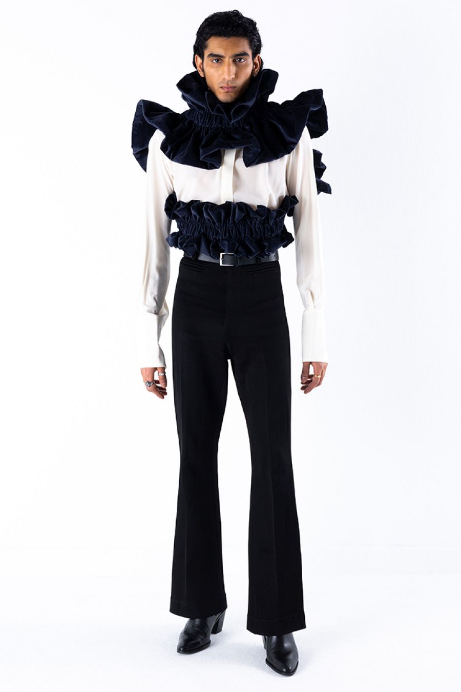 El telón cuando cae se transforma en prenda. Los pantalones son de talle alto, como de bailaor, y pata ancha, al gusto setentero. Las partes de arriba son sofisticadas y no entienden de géneros. Pliegues, cuellos gorguera, espaldas al aire, escotes que se alzan ocultando el rostro, guiños lenceros en forma de corsé... y lazos gigantes que 'atan' manos y cuello y 'callan' la boca. Y todo con un mensaje y mucha crítica social y al sector de la moda.