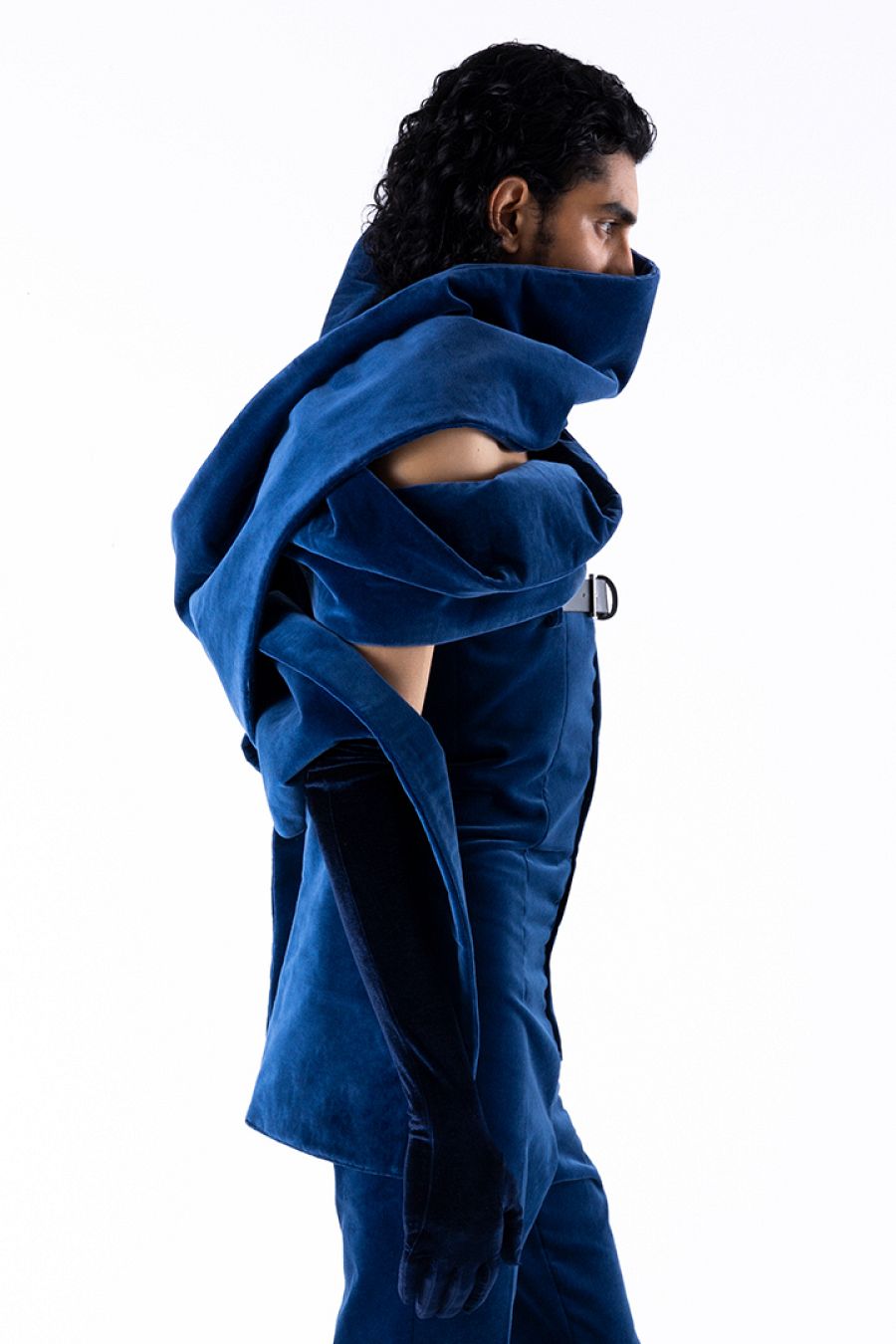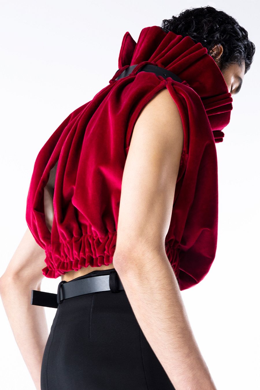 "Puro Teatro habla de cómo me he sentido en estos meses con lo que ha pasado a nivel mundial, y como me siento yo, como un joven diseñador entrando en la industria de la moda. Y hablo de las redes sociales, de que hoy la moda es toda desechable. Todo me parece un teatro, parece que estamos en una performance constante. Por eso utilizó el terciopelo muaré en rojo, como el telón del teatro, para decir que la moda busca el aplauso y ser viral las 24 horas del día. El lazo que te ata las manos y te tapa la boca es un símbolo de cómo me siento, parece que está situación no te permite moverte ni hablar. La industria obliga, por otro lado, a que los diseñadores seamos celebrities e influencers, como si todos ahora actuasemos desde casa. Pero yo no soy de selfie. Eso no me interesa".