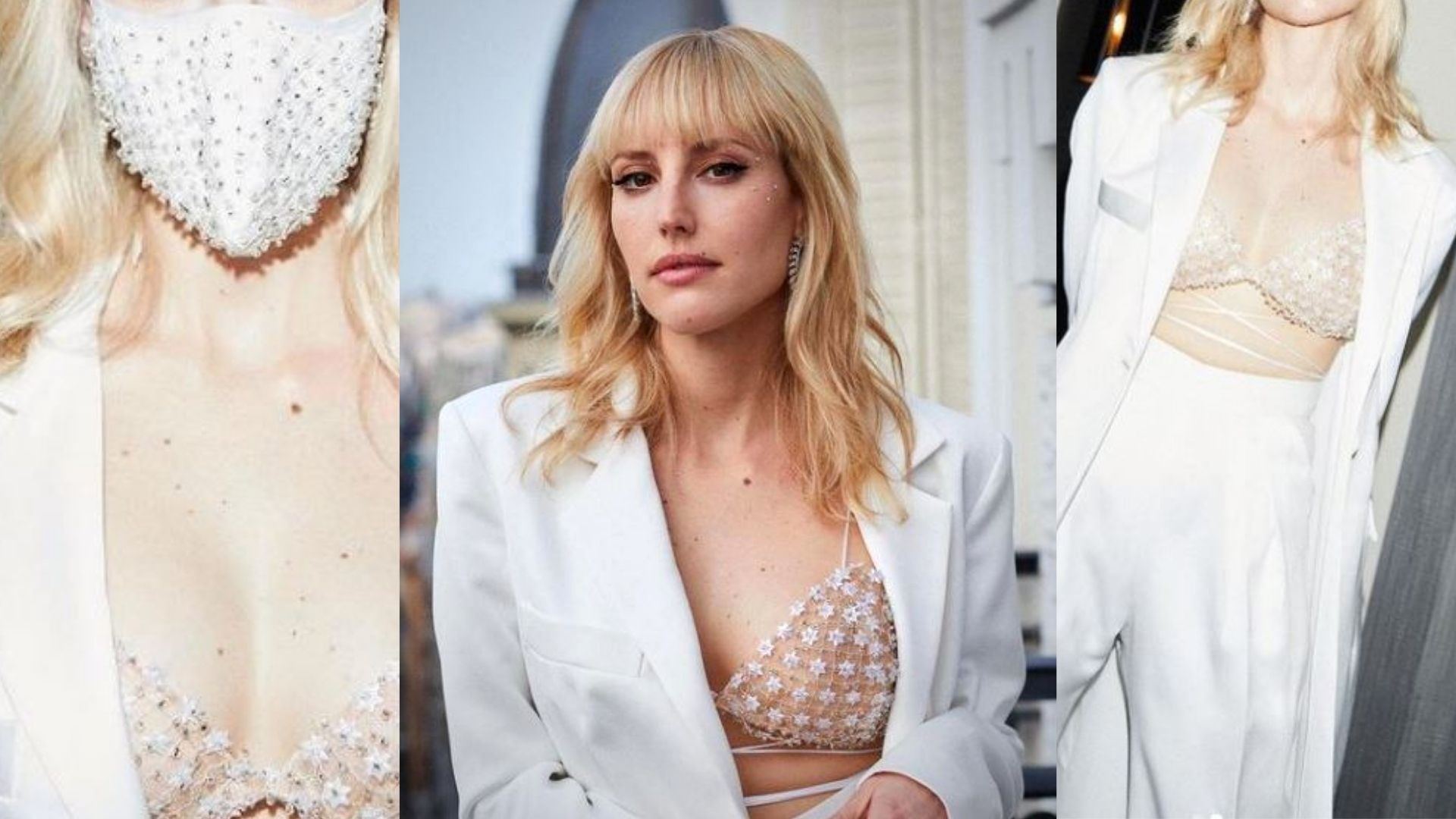 Provocadora y muy moderna, Natalia de Molina ha apostado por la moda española con un diseño del español Juan Carlos Pajares. Un elegante traje de satén en seda blanca y con un top de encaje, tipo bralette-joya con tiras cruzadas bajo el pecho y confeccionado con malla bordada con estrellas y abalorios 3D semitransparentes.