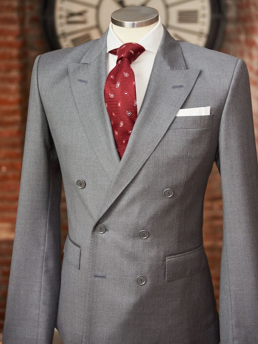 El traje en tono gris claro con raya diplomática blanca, cruza a seis botones y con zapatos de Christian Louboutin.