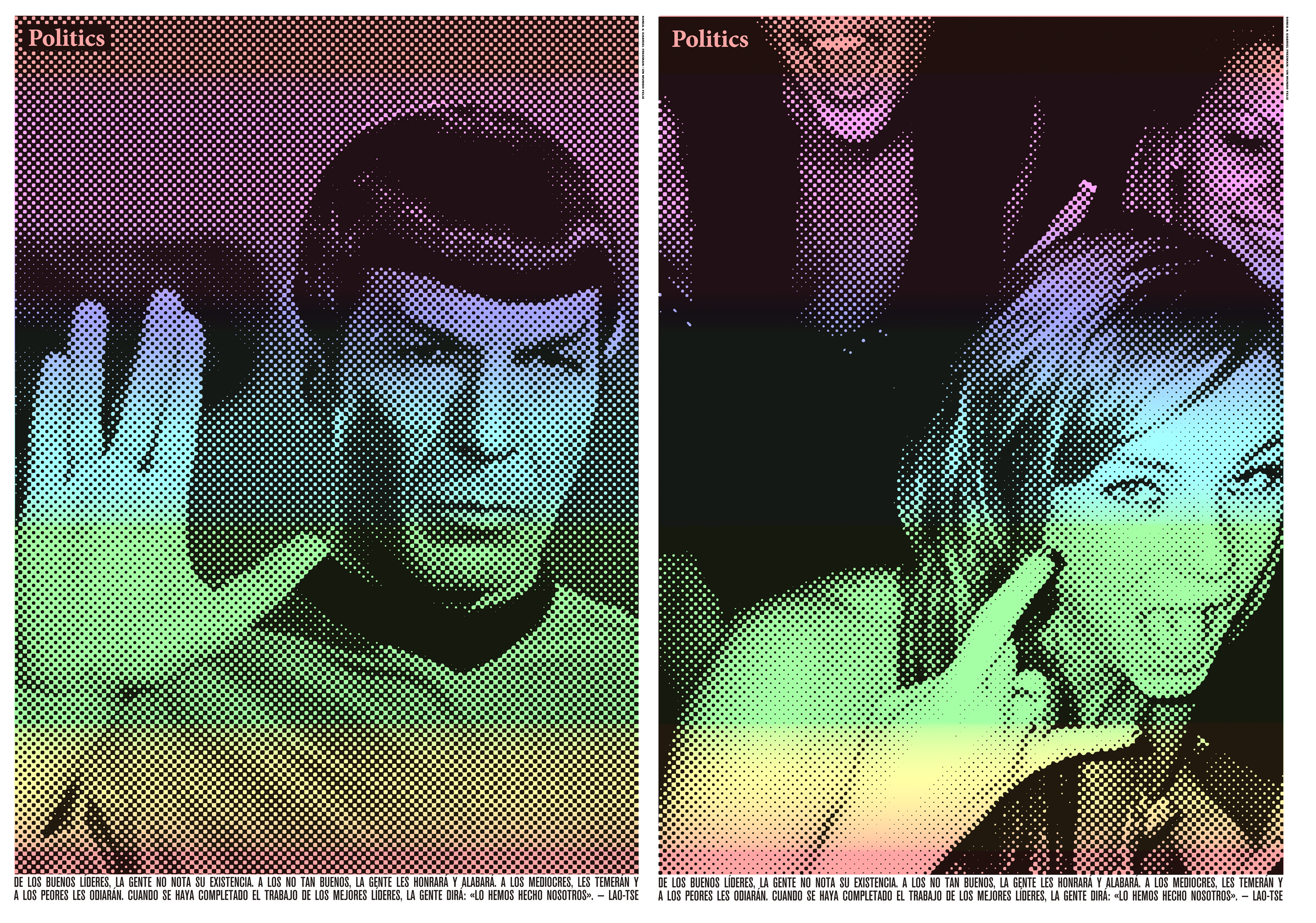 Sin embargo, a UN MUNDO FELIZ no le interesa la Política ni la ideología más que en su sentido más amplio, pues consideran que todos participamos en política en la medida en que vivimos en sociedad. En la serie Politics, por ejemplo, cuestionaban algunos conceptos aplicando la palabra ‘POLITICA’ a diferentes imágenes para llamar la atención sobre lo que supone mirar diversas cuestiones bajo el prisma de la política.