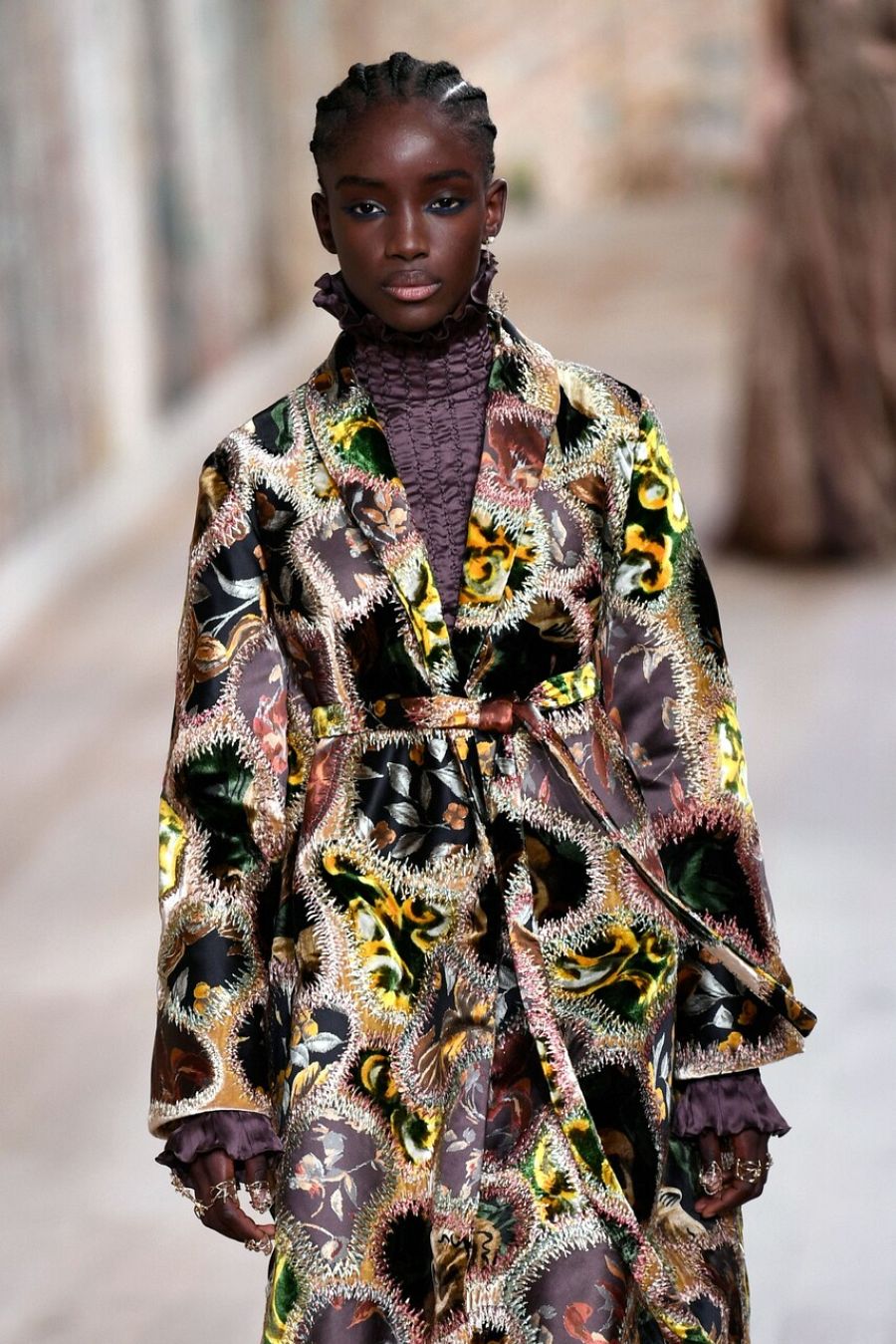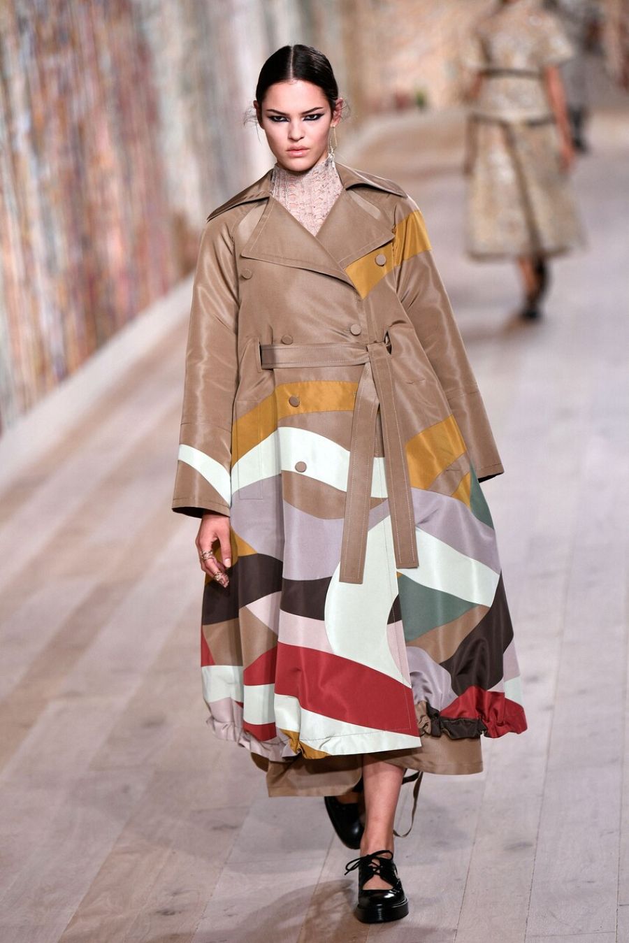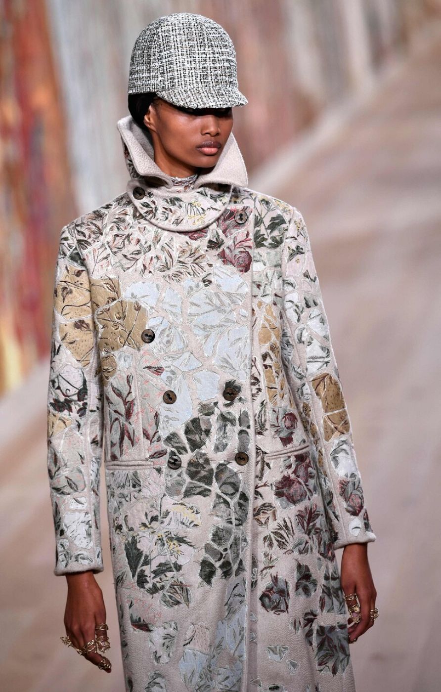 El punto bohemio que tiene Chiuri se aprecia en faldas de seda trabajadas con distintos retales estampados, tipo "patchwork", algo que se repite en los abrigos, que mezclan seda y terciopelo. Las cazadoras cortas, las chaquetas "bomber", las bermudas, las faldas a media pierna, los pantalones cortos y las capas se declinan a golpe de lana, y llaman la atención los diseños más fluidos: vestidos en gasa transparente, estructurados en torno a un corsé, pieza que la casa ha puesto de moda después de ver a Barbara Pravi en el Festival de Eurovisión 2021. Chiuri es una rebelde silenciosa y de vez en cuando lanza una pequeña osadía. Ahora vemos contrastes potentes como los impermeables estampados que se llevan sobre vestidos de plumas y faldas asimétricas.