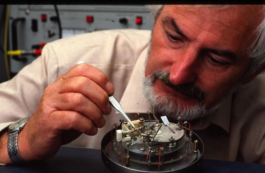 El premio Nobel Heinrich Rohrer manipulando una pieza del microscopio de efecto túnel en el laboratorio de IBM en Zúrich. Imagen cedida por IBM Research.