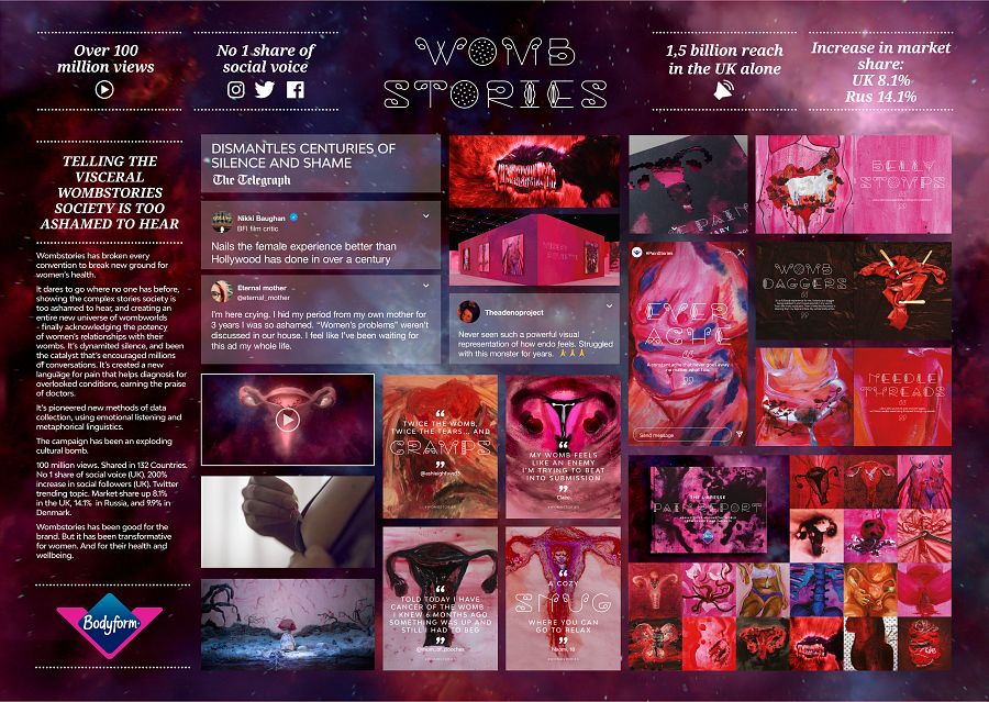 "Wombstories" ("Historias del útero") de AMV BBDO Londres para Essity-Bodyform: Es sin duda uno de los trabajos creativos más brillantes de la temporada. Afronta desde un ángulo distinto las vicisitudes que las mujeres atraviesan a lo largo de su vida con relación a la menstruación y a su aparato genital. Se aportan las historias de seis mujeres que viven desde el desgarro de un aborto hasta los dolores que provoca una endometriosis, pasando por las sensaciones de la primera regla.