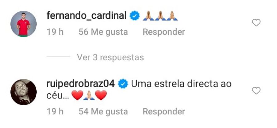 Son cientos de miles los comentarios que se acumulan en la publicación de Cristiano, entre ellos, muchos compatriotas portugueses, ya sean del mundo del fútbol o de la televisión. Fernando Cardinal, jugador de fútbol sala del Sporting de Lisboa o el famoso periodista deportivo portugúes Rui Pedro Braz le mandan también sus condolencias.