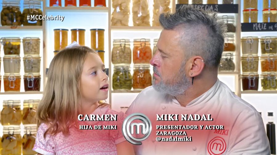 Ha entrado corriendo al plató para abrazar a su padre y jugar con su nueva cresta (al estilo Dabiz Muñoz y para cumplir su promesa por haber llegado a la final): “¡Pareces un gallo!”. Nunca hemos visto esta faceta de Miki Nadal, emocionado e ilusionado. A la pregunta de Samantha sobre si sabe lo que hace su padre en la televisión, la pequeña Carmen lo tiene bastante claro: “el tonto”.