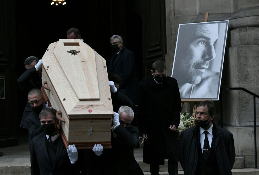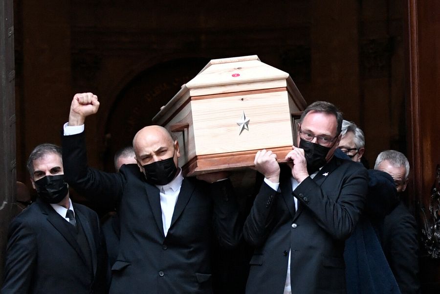 Los restos de Thierry Mugler salen a hombros del funeral celebrado en París. AFP