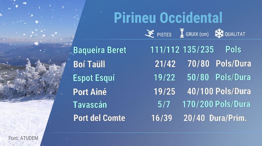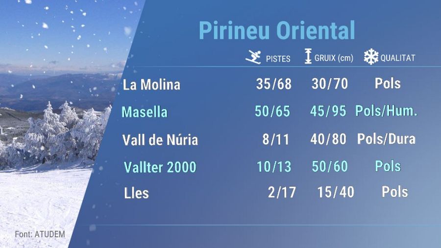 Al Pirineu Oriental, els gruixos oscil·len entre els 40 i els 80 cm. La qualitat de neu és entre pols i dura, o fins i tot primavera al Port del Comte. En la majoria d'estacions trobem els 60/90% de les pistes obertes.