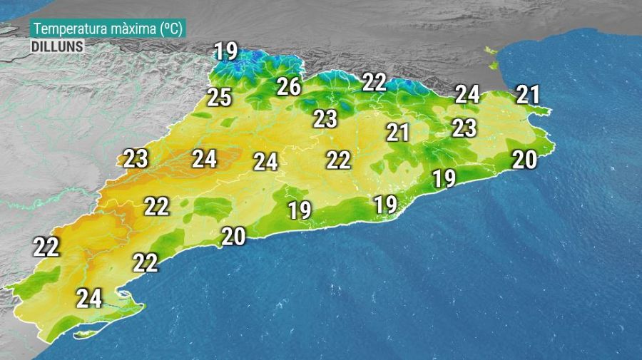 - DILLUNS DE PASQUA: Ens menajrem la mona, amb un temps plàcid, assolellat i suau. Només creixeran nuvolades de tarda en zones de muntanya. Mlts termòmetres per damunt els 20 graus, sobretot a l'interior. A la costa, el vent humit frenarà les temperatures, per sota els 20 ºC.