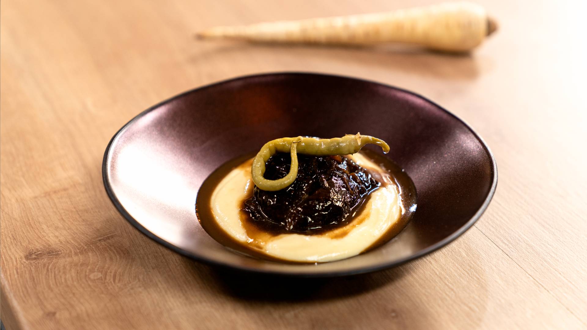 El puré de chirivía le aporta un sabor dulzón que le sienta genial a esta carne que, junto al vino, tiene más potencia. Apuntad esto: este guiso está más rico si lo comemos un día después de haberlo cocinado.