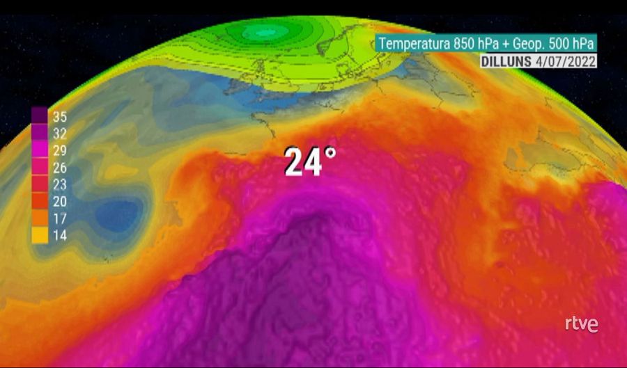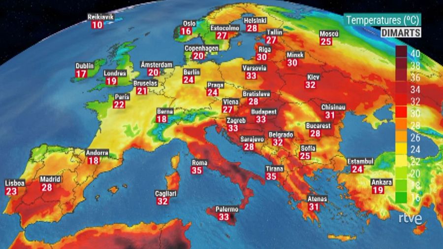 Aquests dies, l'entrada del vent del nord i el pas de diversos fronts mantenen les temperatures a ratlla a la península i als països de l'Europa més occidental. Aquest dimarts es preveu una temperatura màxima de 19 ºC a Londres, 23 ºC a Lisboa, 28 ºC a Madrid o de només 18 ºC a Andorra la Vella. Temperatures de luxe per estar a les portes del mes de juliol. De fet, contrasten amb 35 ºC que previsiblement tindran a Roma, i més de 30 ºC a Budapest, Varsòvia, Riga, Kiev o 28 ºC de Helsinki.