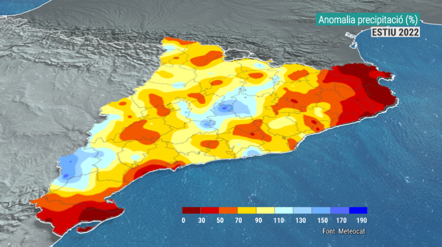 Les quantitats més copioses de precipitació han caigut al Pirineu i Prepirineu, amb valors estacionals màxims al voltant de 350 mm en aquests sectors. Els mínims, inferiors als 20 mm se situen a les comarques de l’Alt i Baix Empordà i el Montsià. La sèrie històrica de Figueres – Cabanes (Alt Empordà), amb dades des de 1950, ha registrat el seu segon estiu més sec, després del passat 2021.
