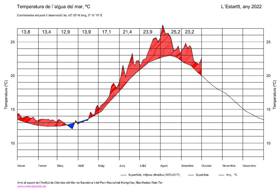 Malgrat la baixada de les temperatures dels darrers dies, el fet d'haver tingut un estiu molt càlid i amb temperatures elevades persistents, mantenen el mar força temperat. A més, a causa de la inèrcia i segurament amb l'ajuda dels corrents marins, l'aigua més propera a la superfície del mar a l'Estartit encara es troba a uns 22,7 ºC, el registre més alt en un mes d'octubre després dels 22,8 ºC del 2 d'octubre del 1990 i dels 23 ºC del 3 d'octubre de 2017. Per tant, l'actual és el tercer valor més alt a l'octubre dels últims gairebé 50 anys.Així ho constaten les dades obtingudes per l'observador de l'Estartit, Josep Pascual.