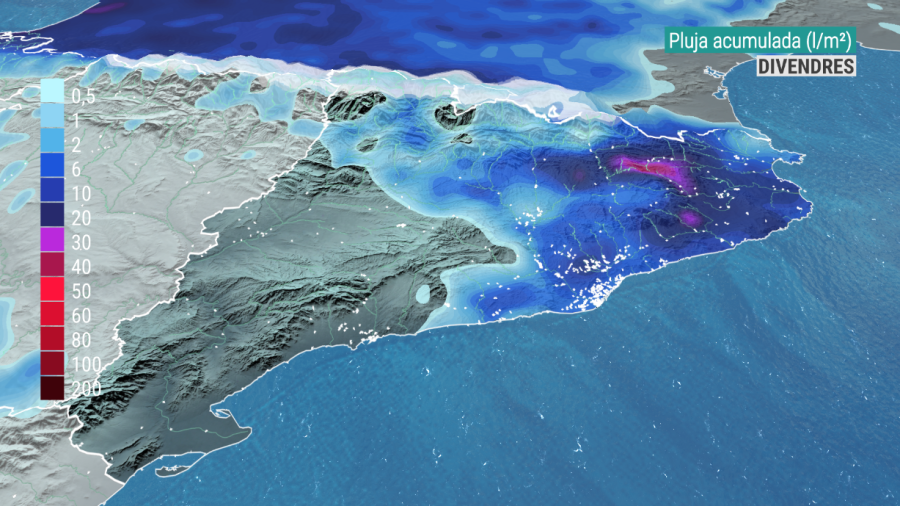 Divendres serà un dia canviant, amb més sol a l’oest i al sud i amb nuvolades que deixaran xàfecs a les comarques de la meitat est, localment intensos i acompanyats de tempesta al litoral i prelitoral. En aquest sentit, hi ha avisos activats al litoral de Barcelona i sud de Girona, on es podrien acumular 20 litres en només 1 hora. També tindrem precipitacions al Pirineu. A la cara nord seran de neu i la cota anirà baixant fins a 1.300 metres a darrera hora.