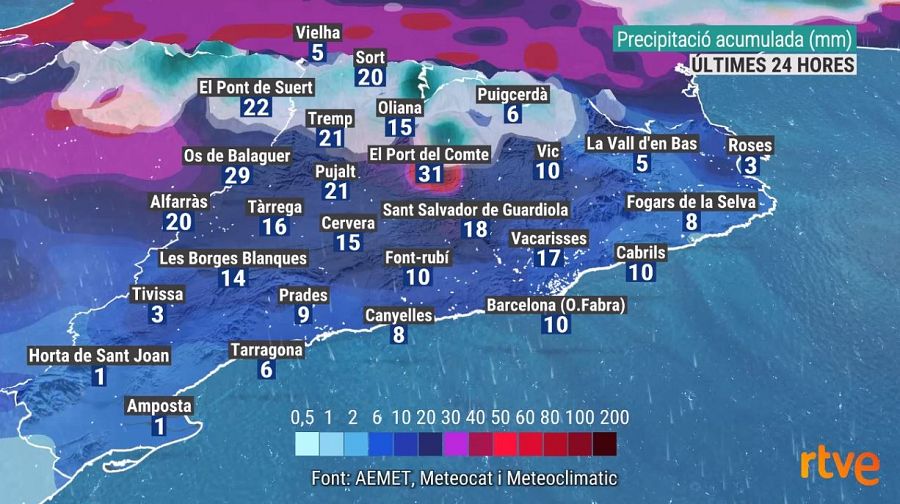 - L'última tongada de pluges generals deixa entre 15 i 20 litres i fins a 10 cm de neu als cims del Pirineu i durant tota la setmana se superen els 40 litres a Ponent, Prepirineu i a la Catalunya Central