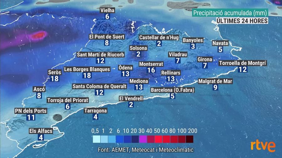 La primera tongada de pluges de la setmana, però, va arribar dilluns, coincidint amb la nevada sorpresa a cotes baixes del Pirineu, amb acumulacions, en general, de 5 a 15 litres, però a punts de Ponent, Catalunya Central i Prepirineu van superar-se de 20 a 35 litres.