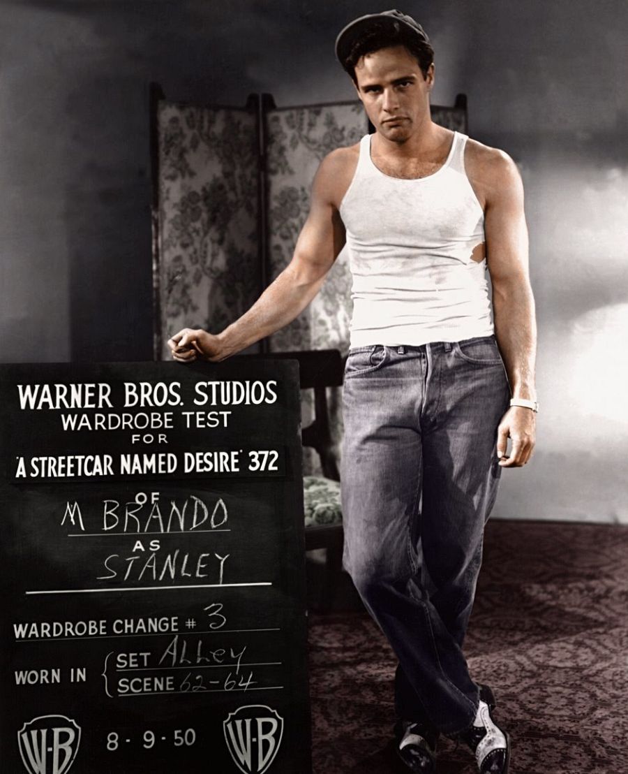 Marlon Brando hizo Un tranvía llamado Deseo primero en teatro y luego en cine, pero fue la versión de Hollywood la que más le encumbró, como actor y como sex symbol. Su interpretación de Stanley Kowalski le valió una nominación al Oscar, la primera de las 8 que obtuvo, e hizo de él un referente sexual y de moda. La diseñadora de vestuario de la película, Lucinda Ballard, dio en la diana con el look del personaje, pero la famosa camiseta de tirantes que Kowalski lleva en la película ha pasado a la historia sobre todo porque la lleva Marlon Brando. Hasta ese momento, y nos remontamos a 1951, la camiseta formaba parte del conjunto de la ropa interior masculina.