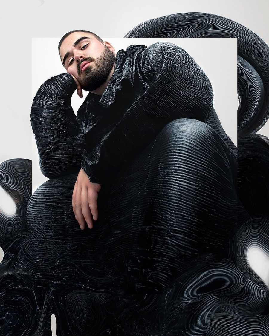Silvano con un look de Issey Miyake MAISON KLAUS