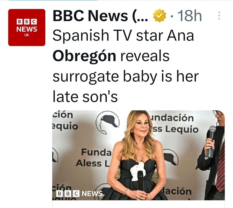 "La actriz y presentadora Ana Obregón dijo ¡Hola! que los médicos habían alentado a su hijo, Aless Lequio García, a conservar muestras de esperma antes de iniciar el tratamiento y que expresó el deseo de tener un hijo justo antes de morir. Las muestras, dijo, estaban almacenadas en Nueva York. Los embarazos subrogados están prohibidos en España, aunque se pueden registrar hijos de este tipo de embarazos en otros países", dice esta publicación, que destaca una frase de las que Ana dijo a la revista ¡HOLA!: “Esta niña no es mi hija, sino mi nieta. Fue el último deseo de Aless traer un niño al mundo”.
