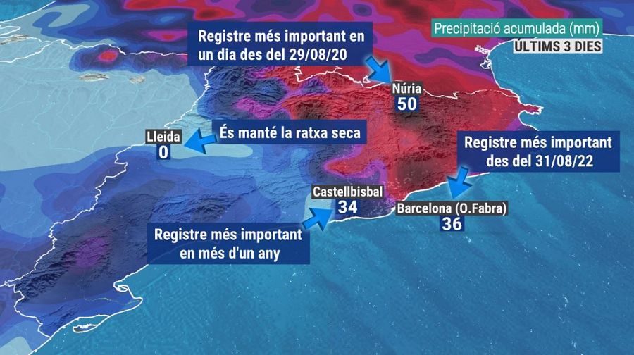 En algunes comarques del litoral i prelitoral central i, també, del sud del Pla de Lleida s'ha trencat la ratxa seca de més de 60 dies. A l'Observatori Fabra de Barcelona no plovia tant des de l'agost de l'any passat i a la part baixa del Llobregat feia més d'un any que no plovia tant. La mala noticia és que hi ha molts indrets de la Depressió Central on no han vist caure ni gota i, per tant, es manté la ratxa seca que agreuja encara més la sequera.