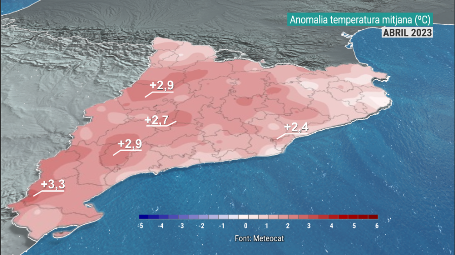 Pel que fa a temperatures, ha estat un abril càlid a tot arreu, sobretot al prelitoral sud, al Prepirineu Occidental, altiplà Central i a punts del Bages i Osona amb anomalies de 2 a 3 graus per sobre la mitjana. Concretament, a lObservatori Fabra s'ha viscut l'abril més càlid de la seva sèrie centenària. I, fins i tot, alguns llocs de les Terres de l'Ebre i de Ponent, ha estat l'abril més càlid des que hi ha registres.