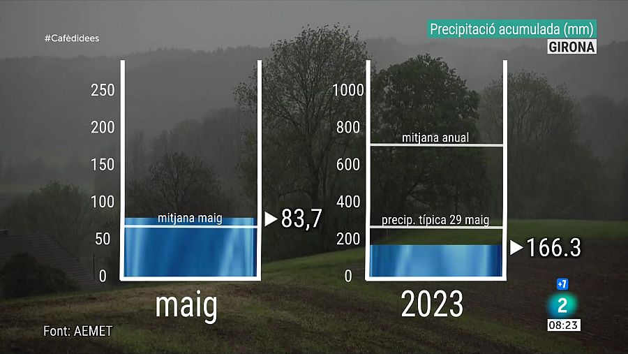 Balanç de precipitació (mm) al maig i aquest 2023 a Girona