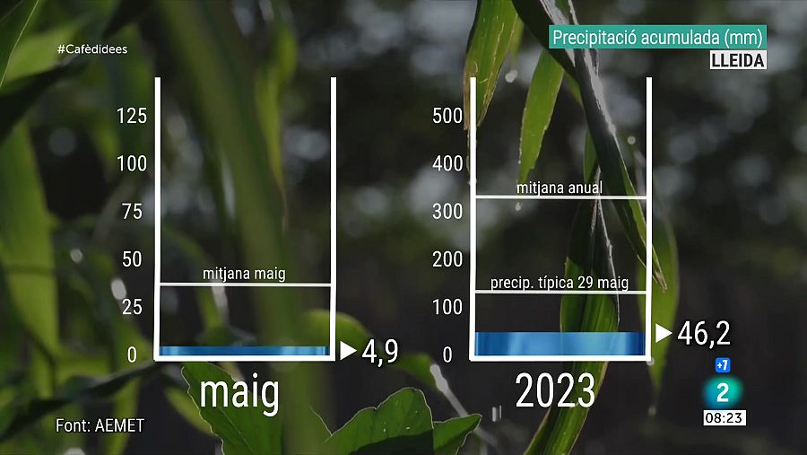 Pitjor és la situació que es viu a Ponent. A Lleida, aquest maig només han tingut 4 dies de plugeta. S’han acumulat menys de 5 litres, això vol dir un 20% del que acostuma a caure. I aquí aquest 2023, la sequera continua extrema, amb només 46 litres recollits en 5 mesos.