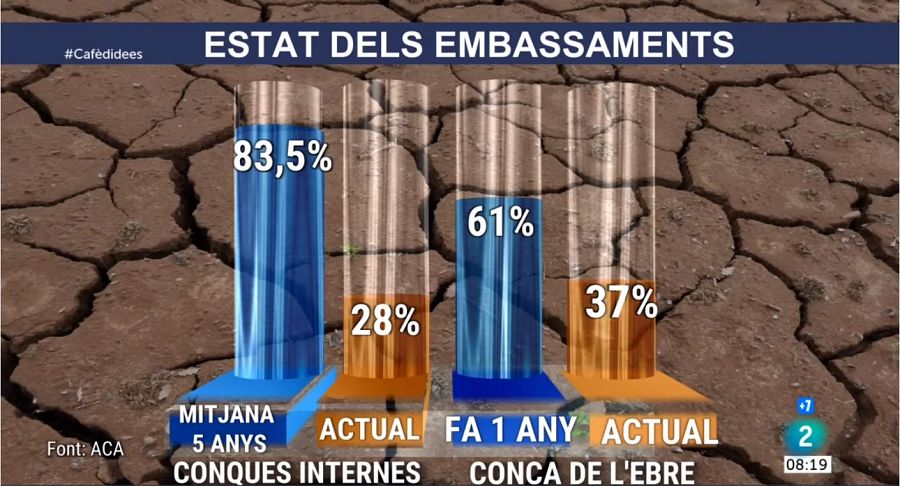La falta d'aigua es nota a tots els embassaments de les conques internes, actualment al 28% de la seva capacitat, lluny del 83% de la Mitjana dels últims anys. Una falta d'aigua que també queda plasmada a la conca de l'Ebre, avui al 37%.