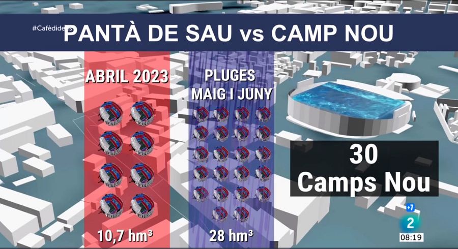 Per tant, quan al mes d'abril les reserves al pantà de Sau van tocar fons, només hi havia 10,7 hm³. Llavors haguéssim omplert poc més de 8 Camps Nou d'aigua. Les pluges caigudes els mesos de maig i juny han afegit uns 25 hm³. Com a resultat, 20 Camps Nou plens d'aigua. Això sumat al que ja teníem de l'abril. A dia d'avui omplim 28 estadis del Barça.