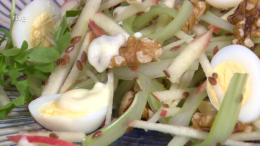 Receta de ensalada de apio crujiente, huevos de codorniz y salsa de yogur rtve